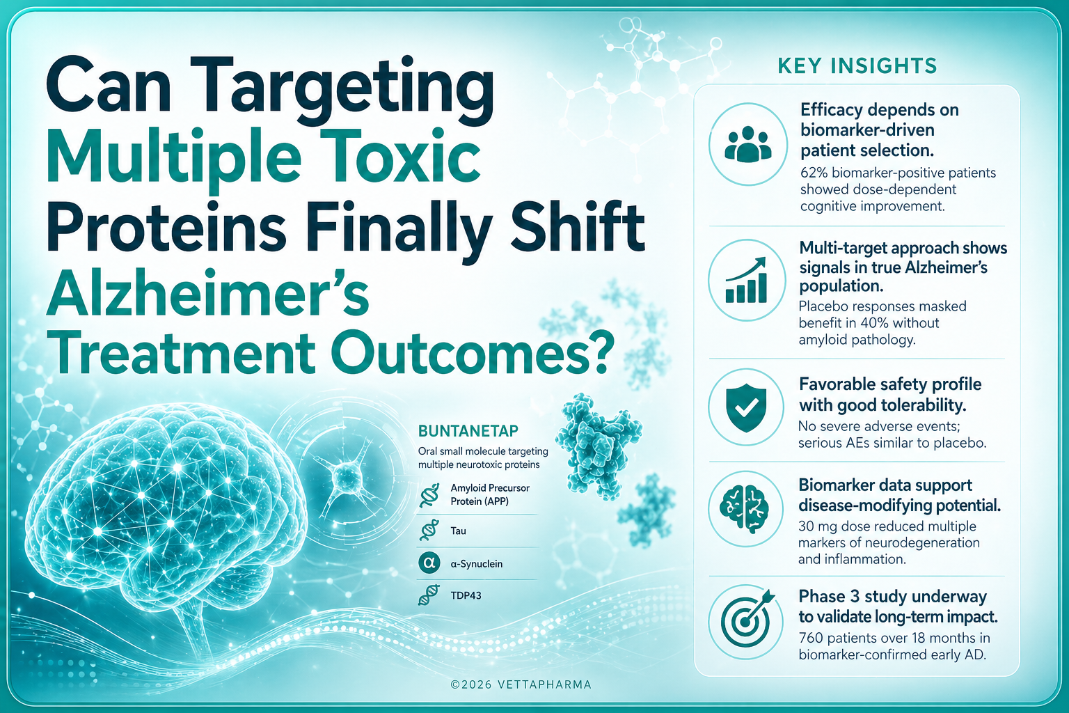 Alzheimer’s disease remains one of the most challenging neurodegenerative disorders, affecting more than 7 million people in the United States alone, with current therapies offering only modest slowing of cognitive decline. A recent Phase 2/3 clinical study evaluating buntanetap, an orally available small molecule designed to inhibit the translation of multiple neurotoxic proteins including amyloid precursor protein (APP), Tau, α-synuclein, and TDP43, explores whether a multi-target approach could provide broader therapeutic benefit.